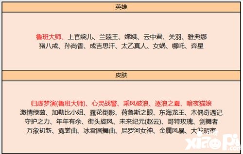 【限免皮肤】:虞姬-云霓雀翎、梦奇-胖达荣荣、干将莫邪-久胜战神、孙悟空-地狱火、孙尚香-末日机甲、达摩-黄金狮子座、后羿-黄金射手座、张良-黄金白羊座、宫本武藏-地狱之眼、貂蝉-仲夏夜之梦、武则天-海洋之心、花木兰-冠军飞将、狄仁杰-超时空战士。
