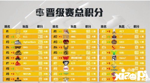 至此晋级赛的15支战队已经全部出炉,他们将分为三组进行决赛的对决,目前分组名单还未发出。前十五名的队伍排名顺序如下: